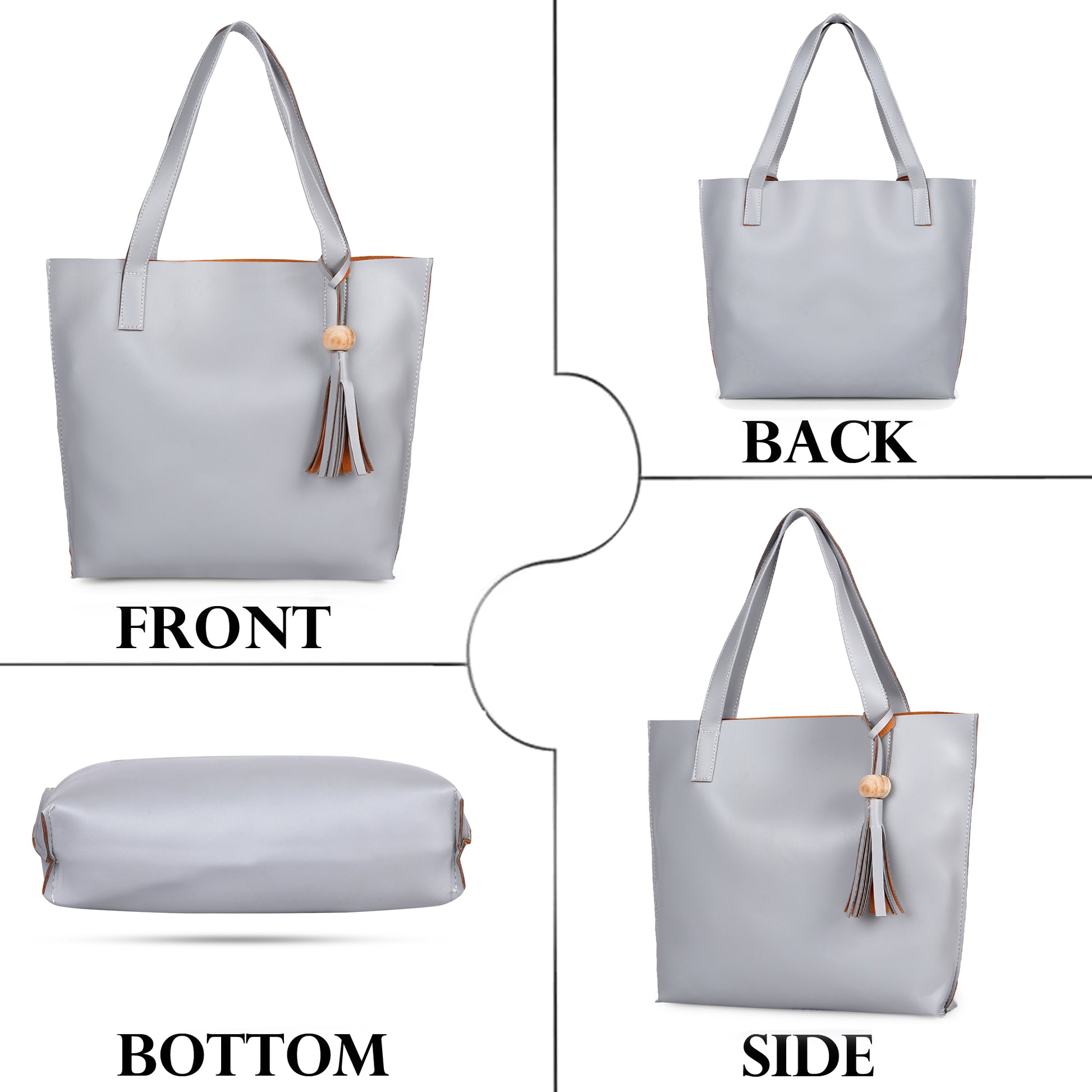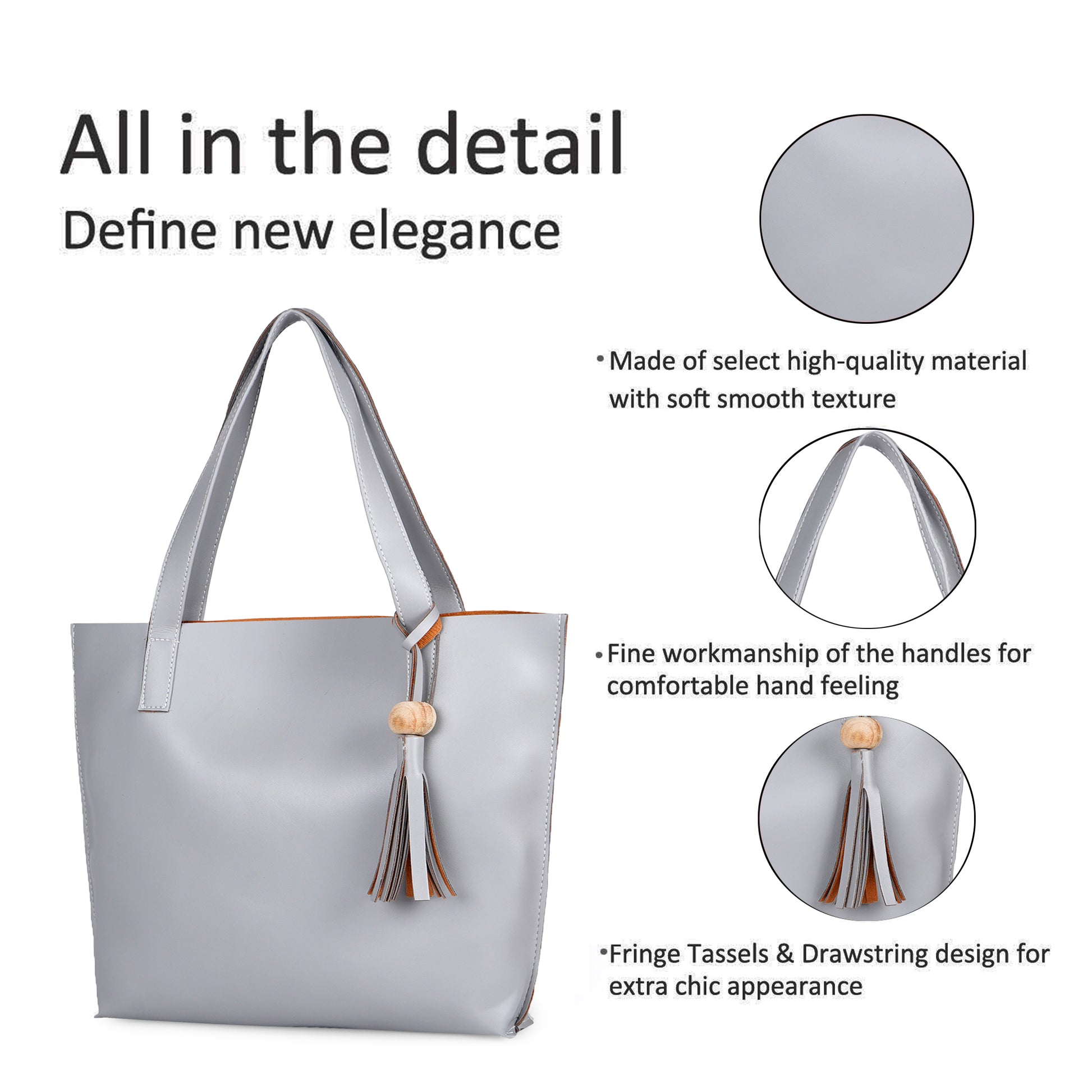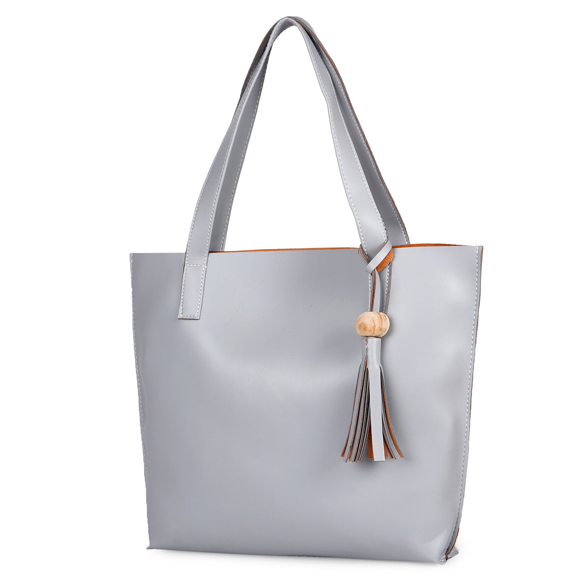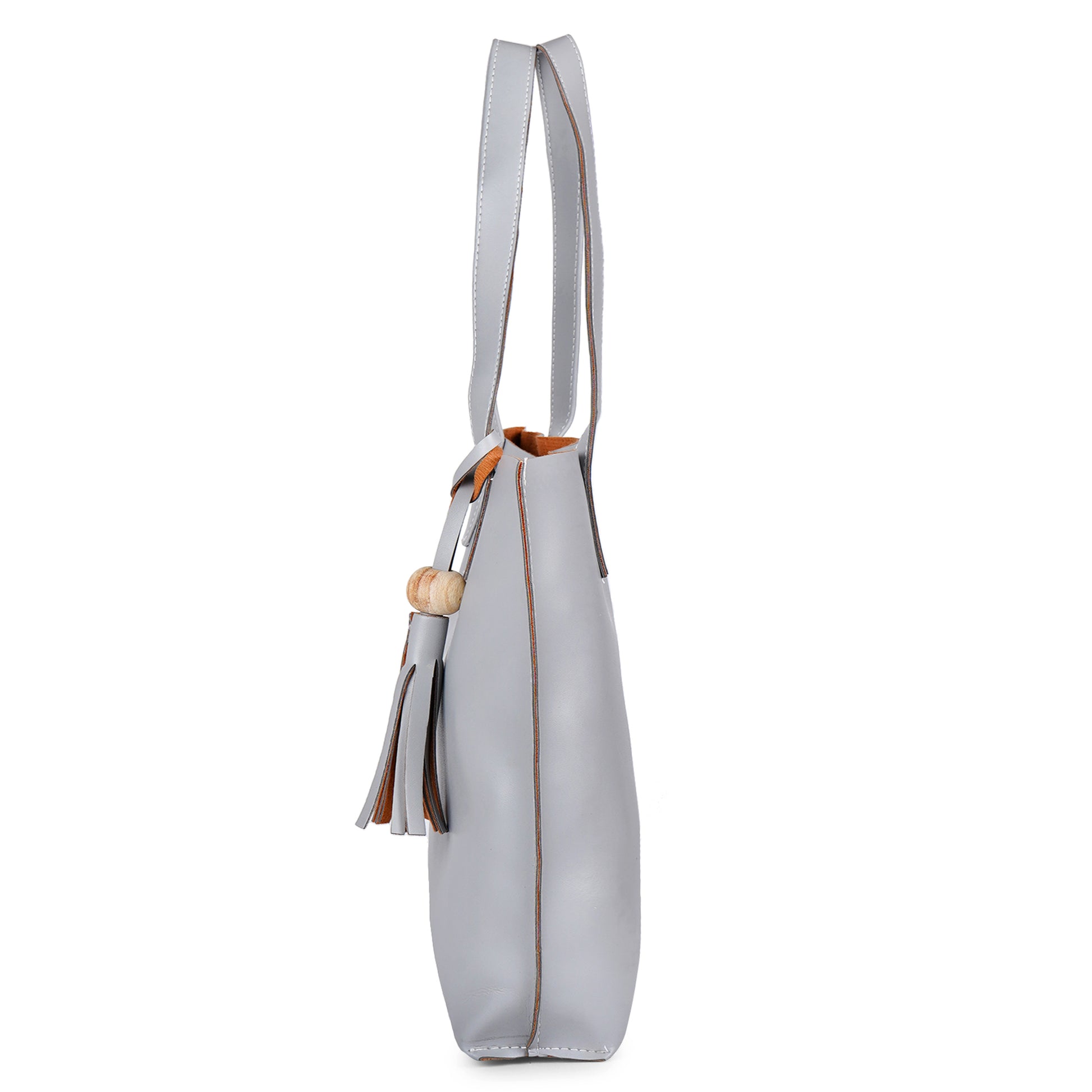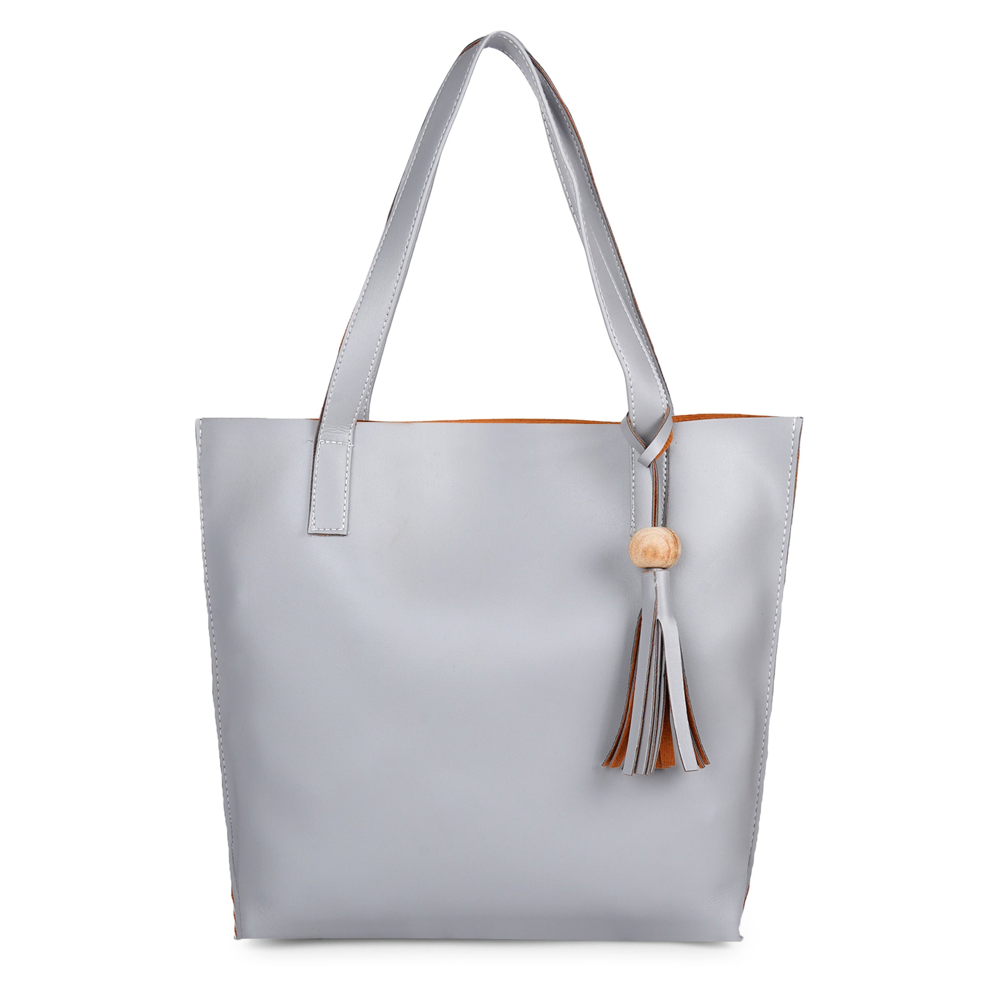 Introducing the Aliza Shopper Vegan Leather Tote Bag in Grey - A0019GREY, where style meets sophistication. This tote bag is the epitome of formal elegance. With its solid pink color and open tote design adorned with fringe, it's a statement piece that effortlessly complements your professional or chic ensemble.