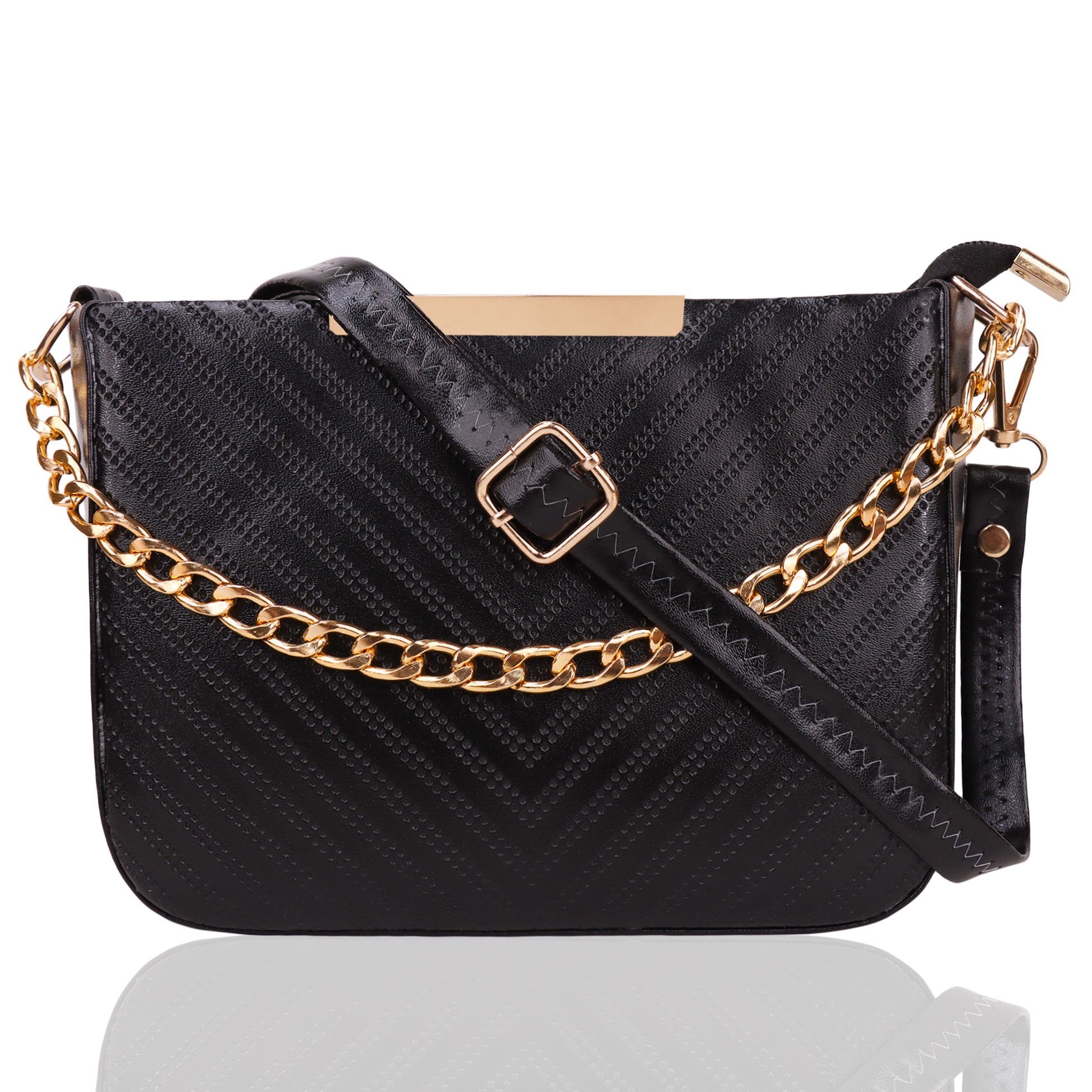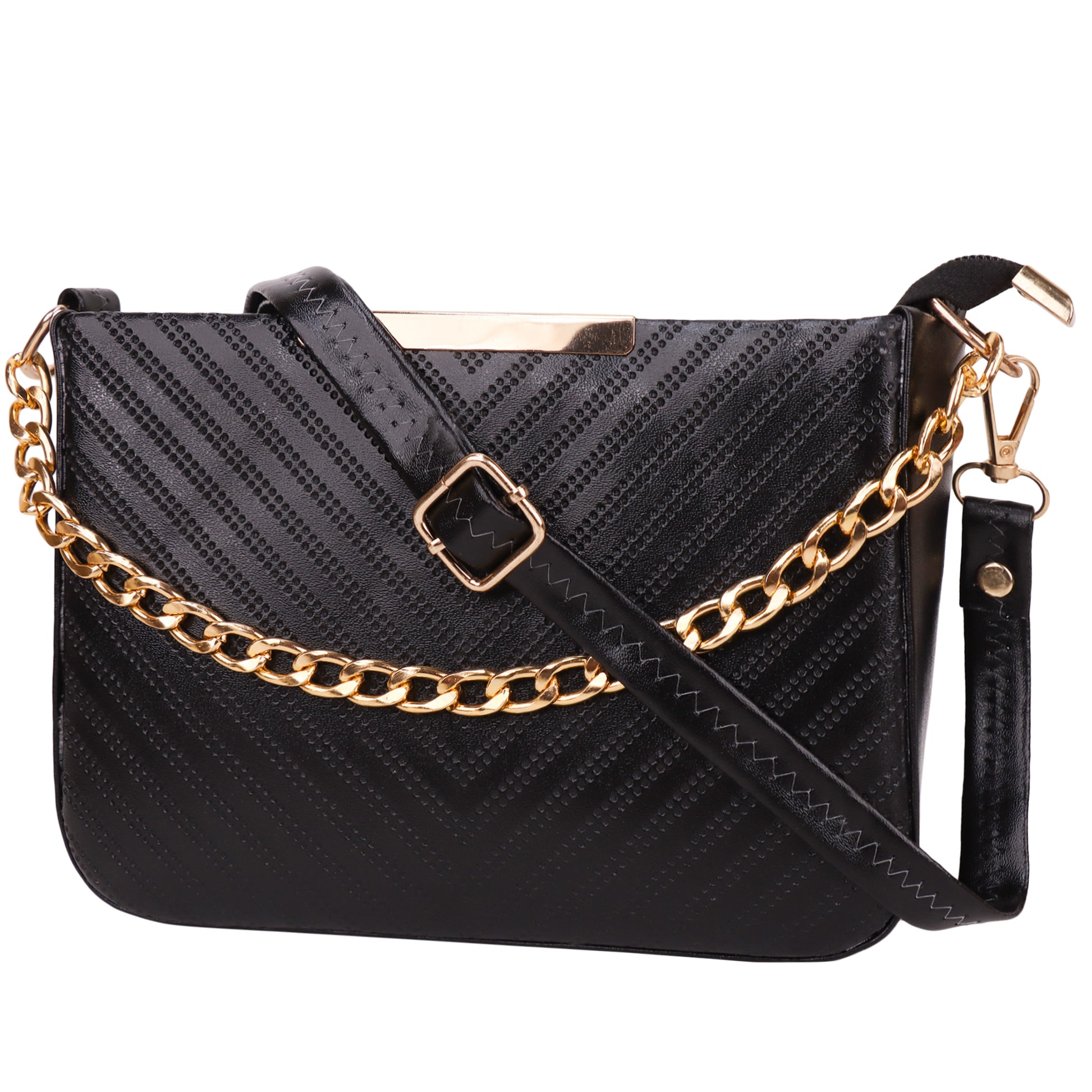 Design: Aliza present Indian made and 100% PeTA approved vegan leather construction Miss Havana Sling Bag. This Bag laser printed dots in V shape. For style the bag it have gold painted link chain hanging in front. It also have gold bar emblem. It have a long adjustable single shoulder crossbody strap with sturdy and durable accessories and a large compartment, this bag offers ample storage space for your essentials.