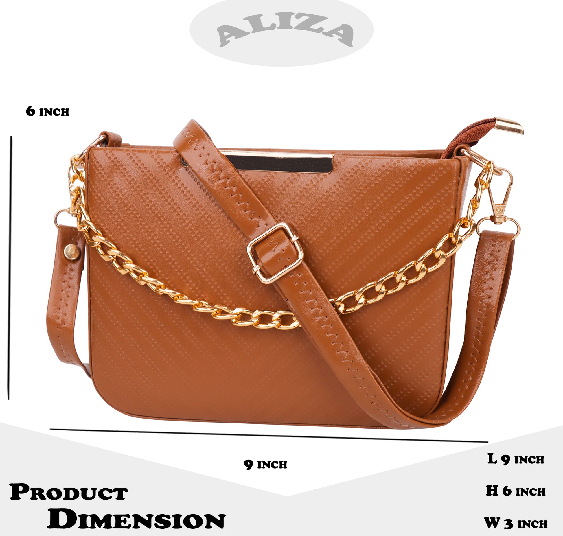 Design: Aliza present Indian made and 100% PeTA approved vegan leather construction Miss Havana Sling Bag. This Bag laser printed dots in V shape. For style the bag it have gold painted link chain hanging in front. It also have gold bar emblem. It have a long adjustable single shoulder crossbody strap with sturdy and durable accessories and a large compartment, this bag offers ample storage space for your essentials.