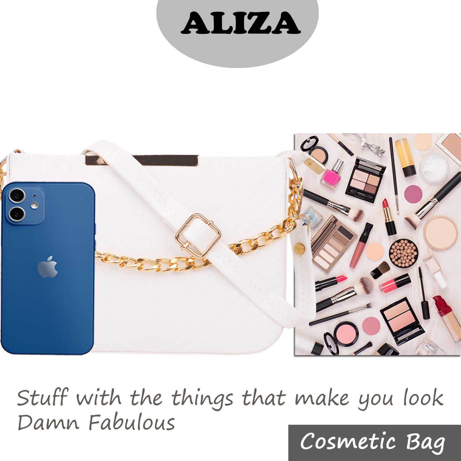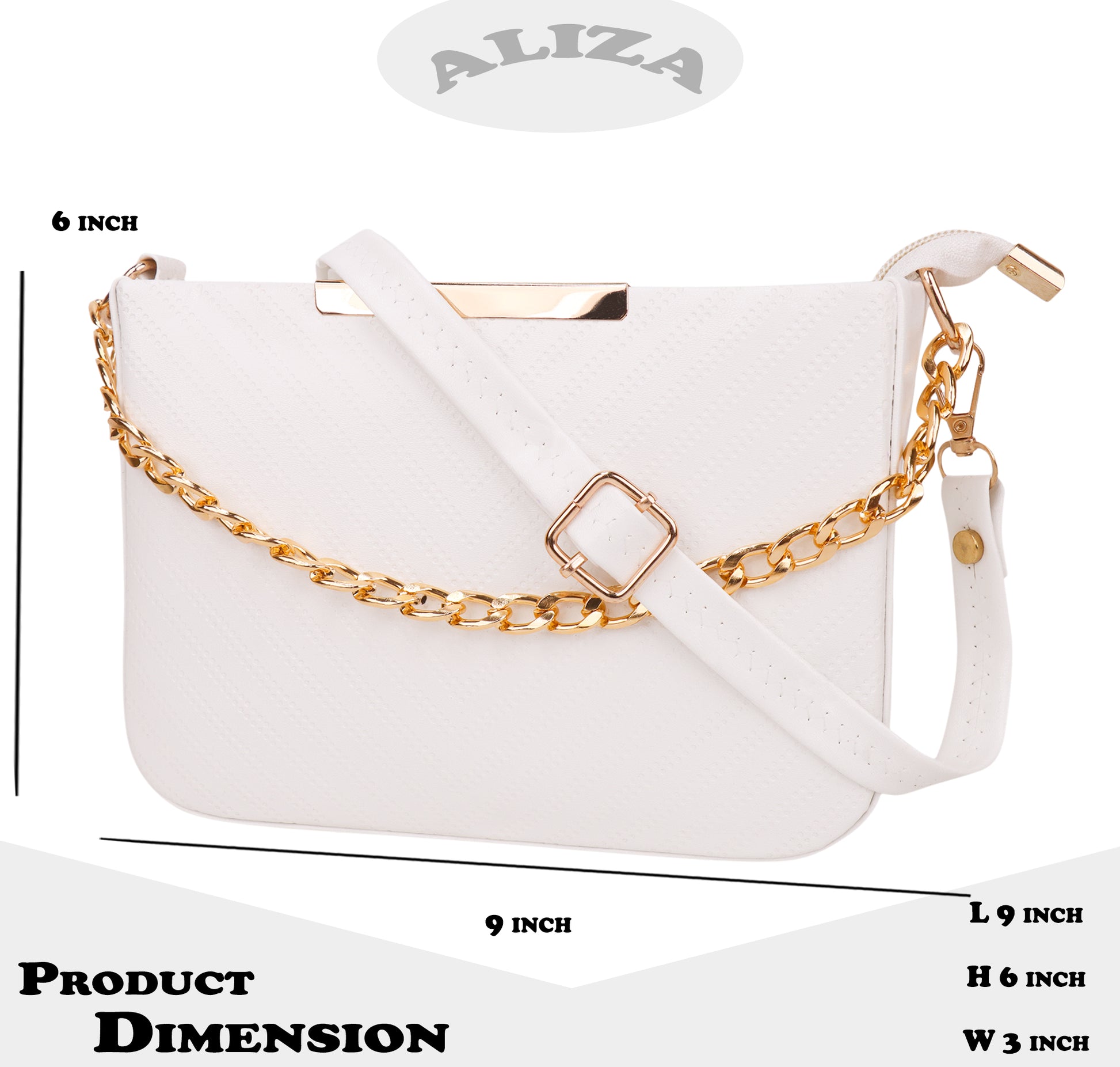 Design: Aliza present Indian made and 100% PeTA approved vegan leather construction Miss Havana Sling Bag. This Bag laser printed dots in V shape. For style the bag it have gold painted link chain hanging in front. It also have gold bar emblem. It have a long adjustable single shoulder crossbody strap with sturdy and durable accessories and a large compartment, this bag offers ample storage space for your essentials.