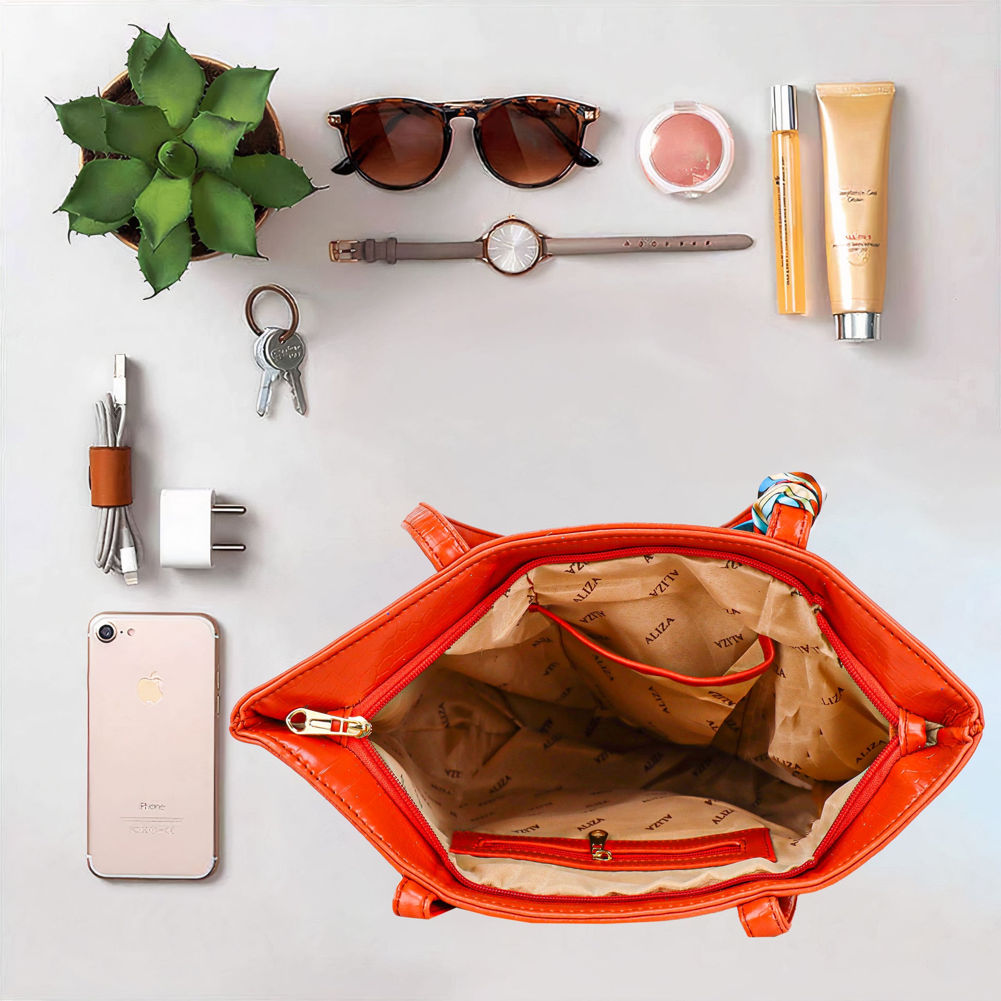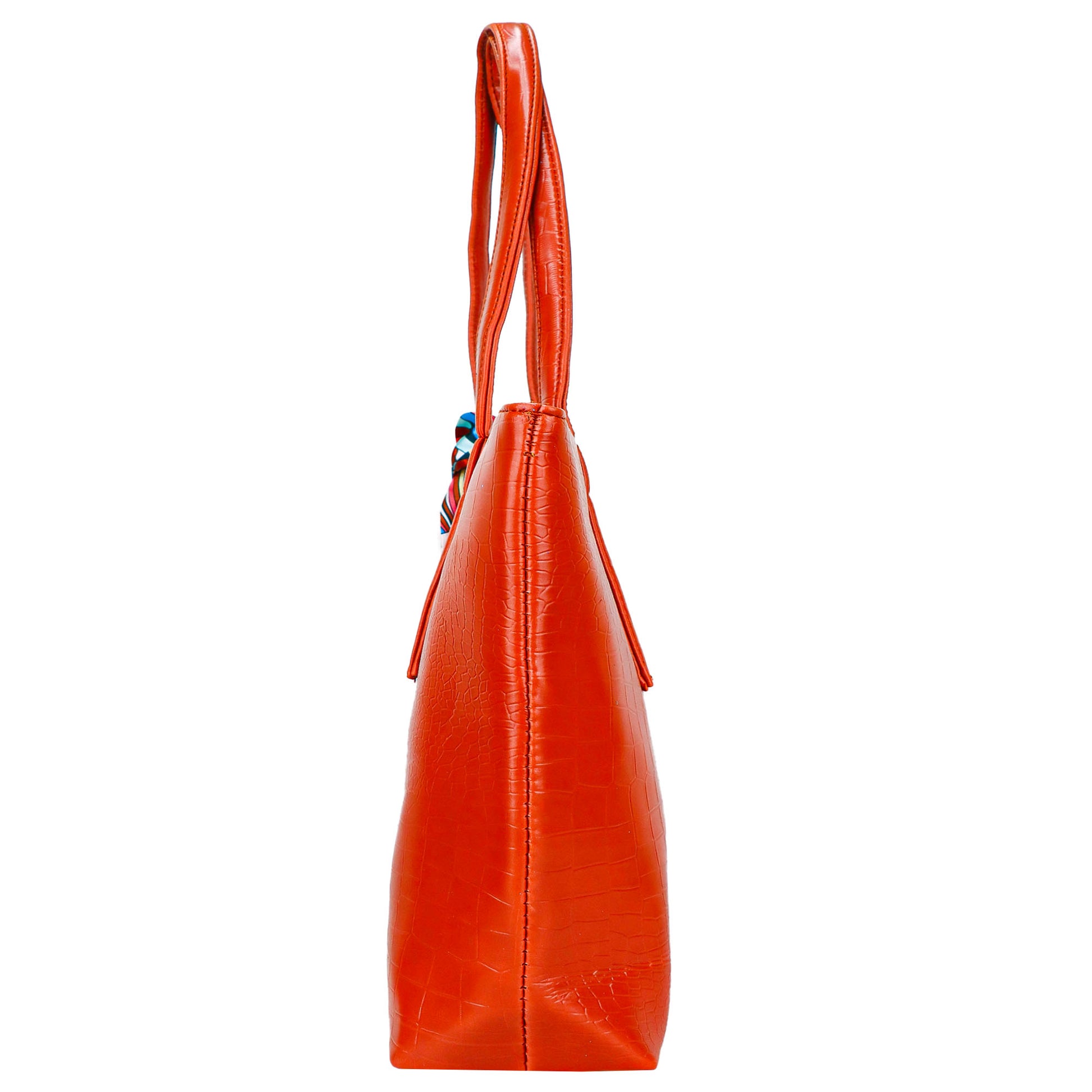 Design: The Croco Bloom Tote Bag boasts a wide rectangular style that's both chic and spacious. The double shoulder handles are adorned with an attractive tie and intricately stitched, offering an exquisite texture that closely resembles real crocodile skin. Whether you're heading to a lunch date or strolling through the city, this bag's design turns heads. The front and back look identically similar, giving it a symmetrical beauty.