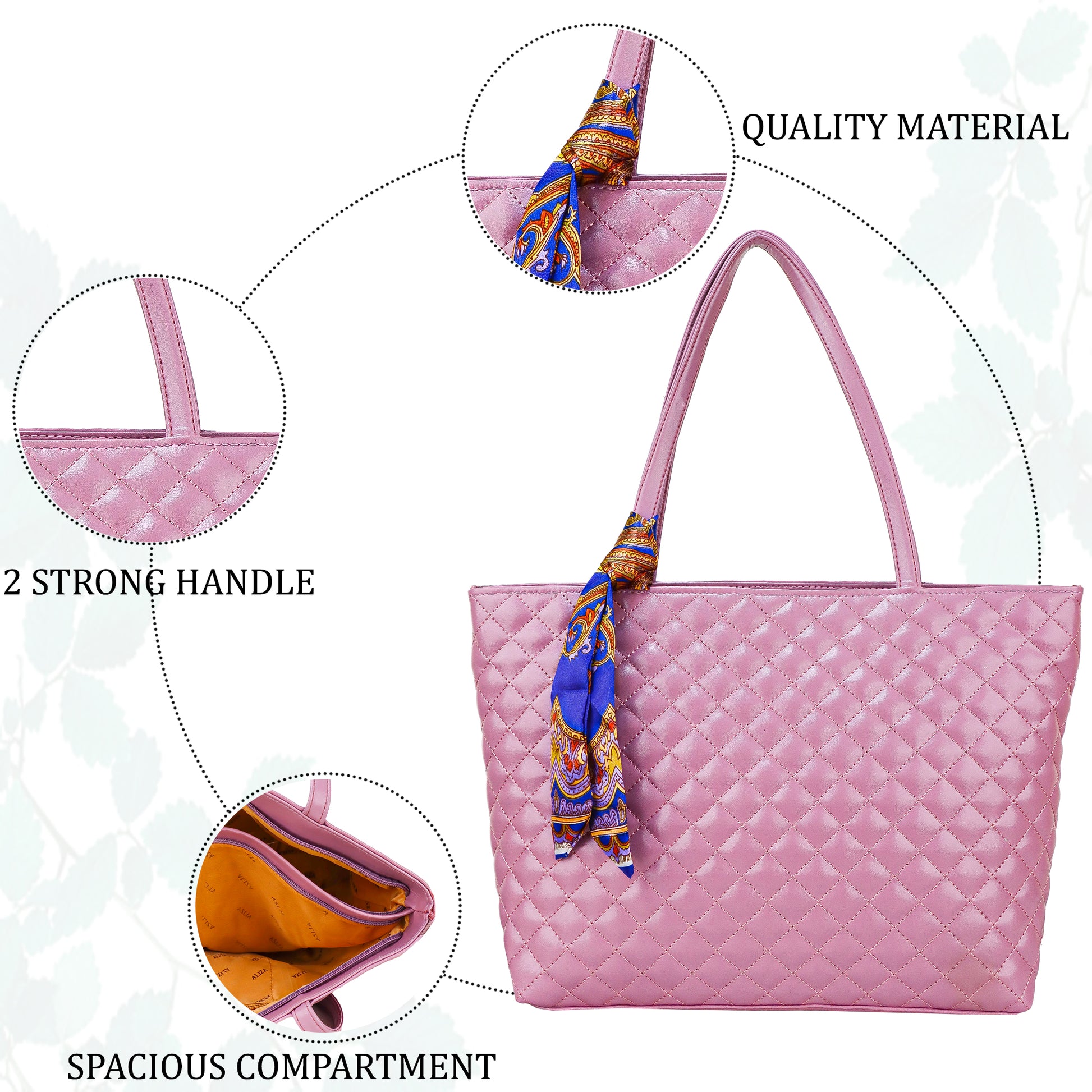 Design: Wide size quilted tote bag, attractive design with beautiful tie hanged on bag's strap which blooming the front side stylish. Also has strong shoulder handles. Front and back looks identically similar.