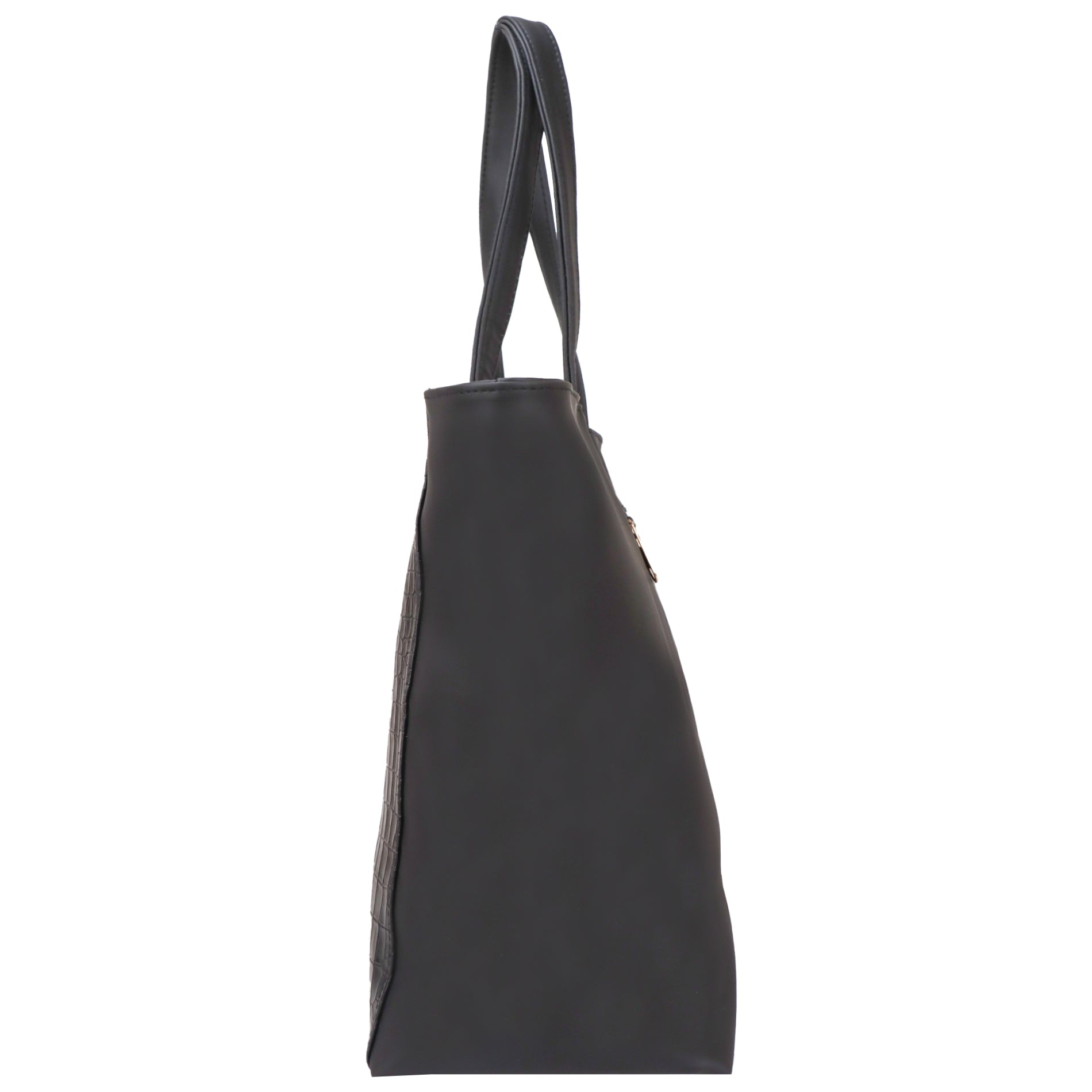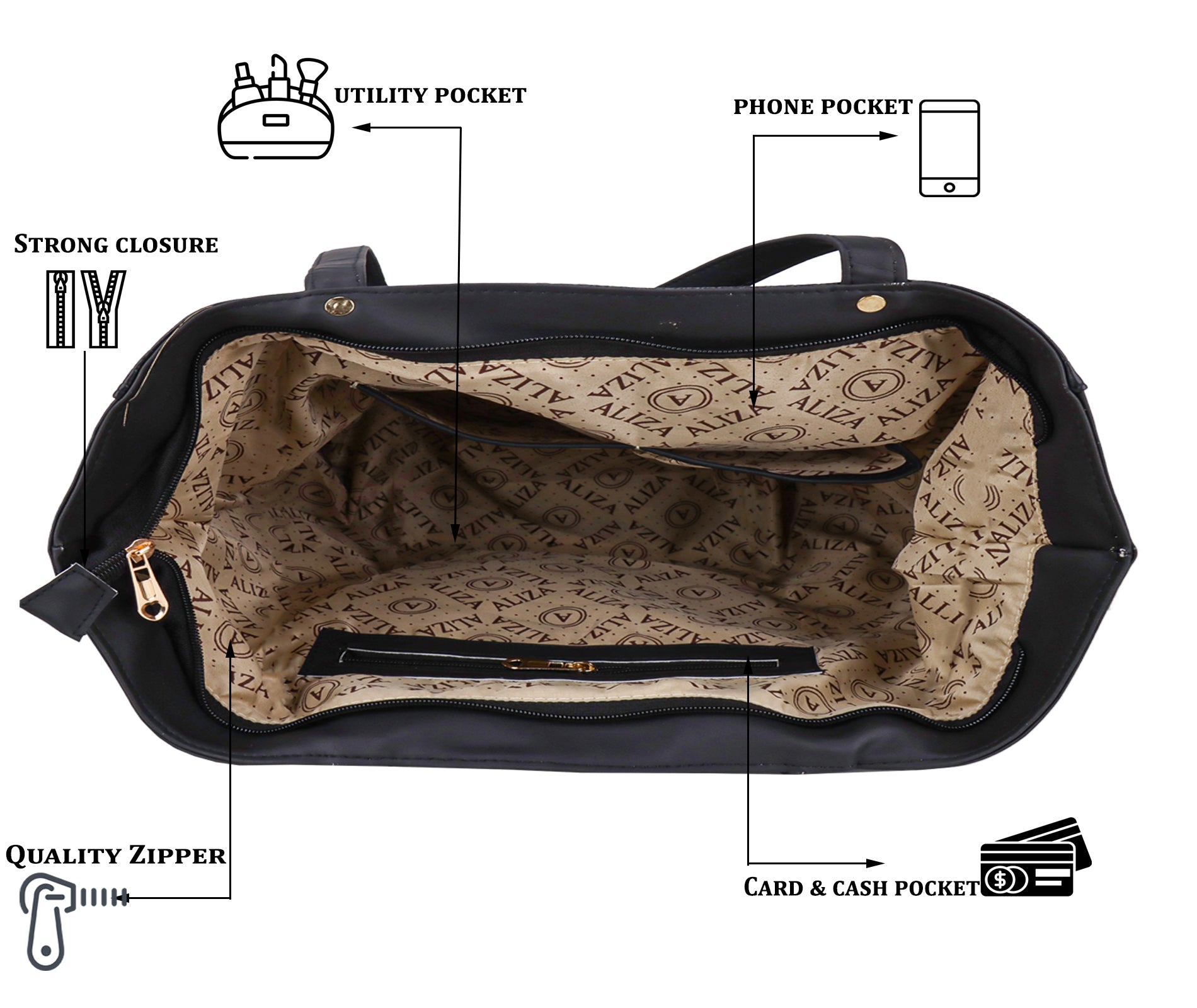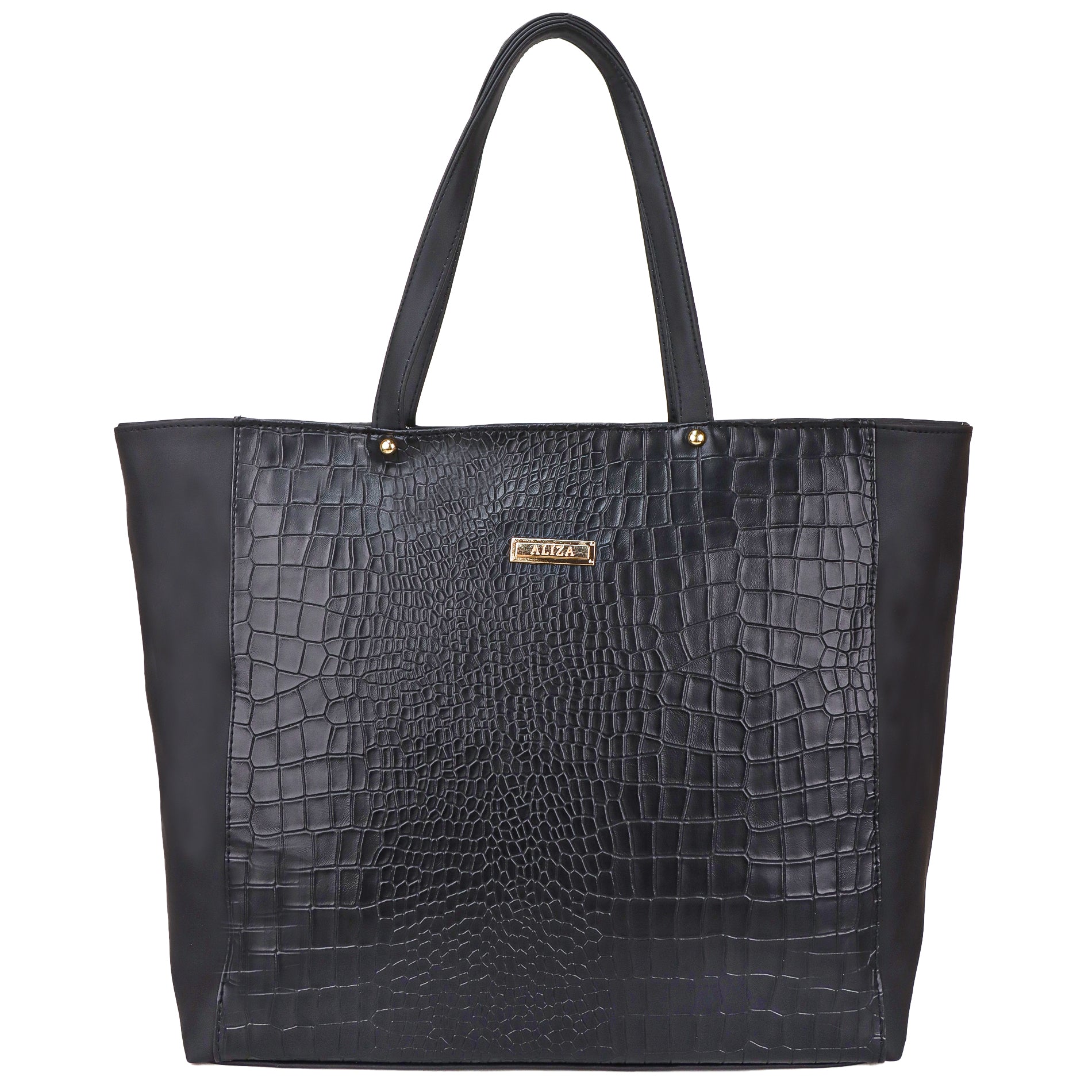 Design: Stylish wide Tote bag with attractive croco skin in front, elegant ALIZA brand logo in upper-center of the front side. Beautifully stitched double shoulder handle detailed with ripit fitting on border. Backside have plain surface with 1 zip closure pocket.